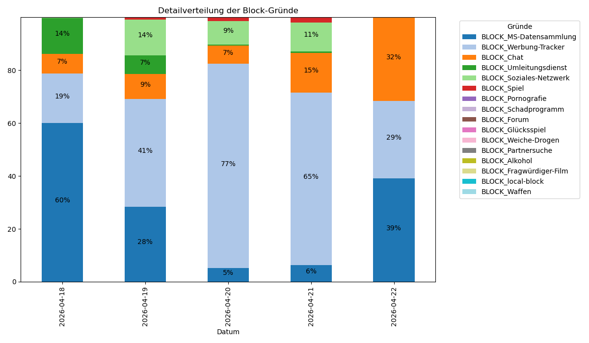 Regelmäßig ist hier der größte Block der Grund „Werbung-Tracker“. Hier sind die Anfragen zu Werbungsseiten und auch die Übermittlung von Daten zur Benutzerverfolgung und Profilbildung zu Werbezwecken („tracking“) zusammengefasst.