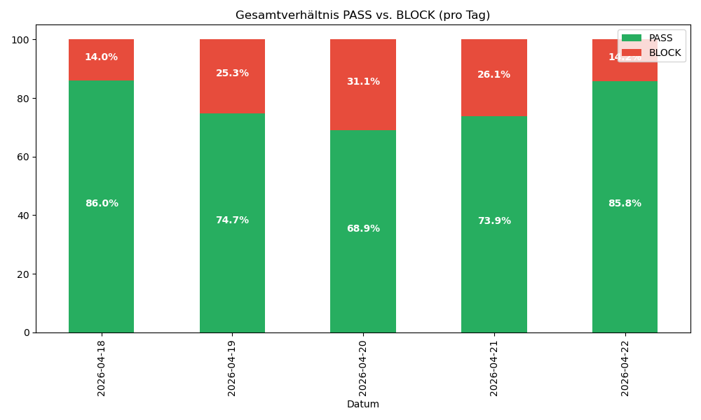 In den beiden folgenden Graphiken wird gezeigt, welchen Anteil der Anfragen der Jugendschutzfilter in den letzten Tagen blockiert hat und wie die Verteilung auf die blockierten Gründe prozentual aussieht: